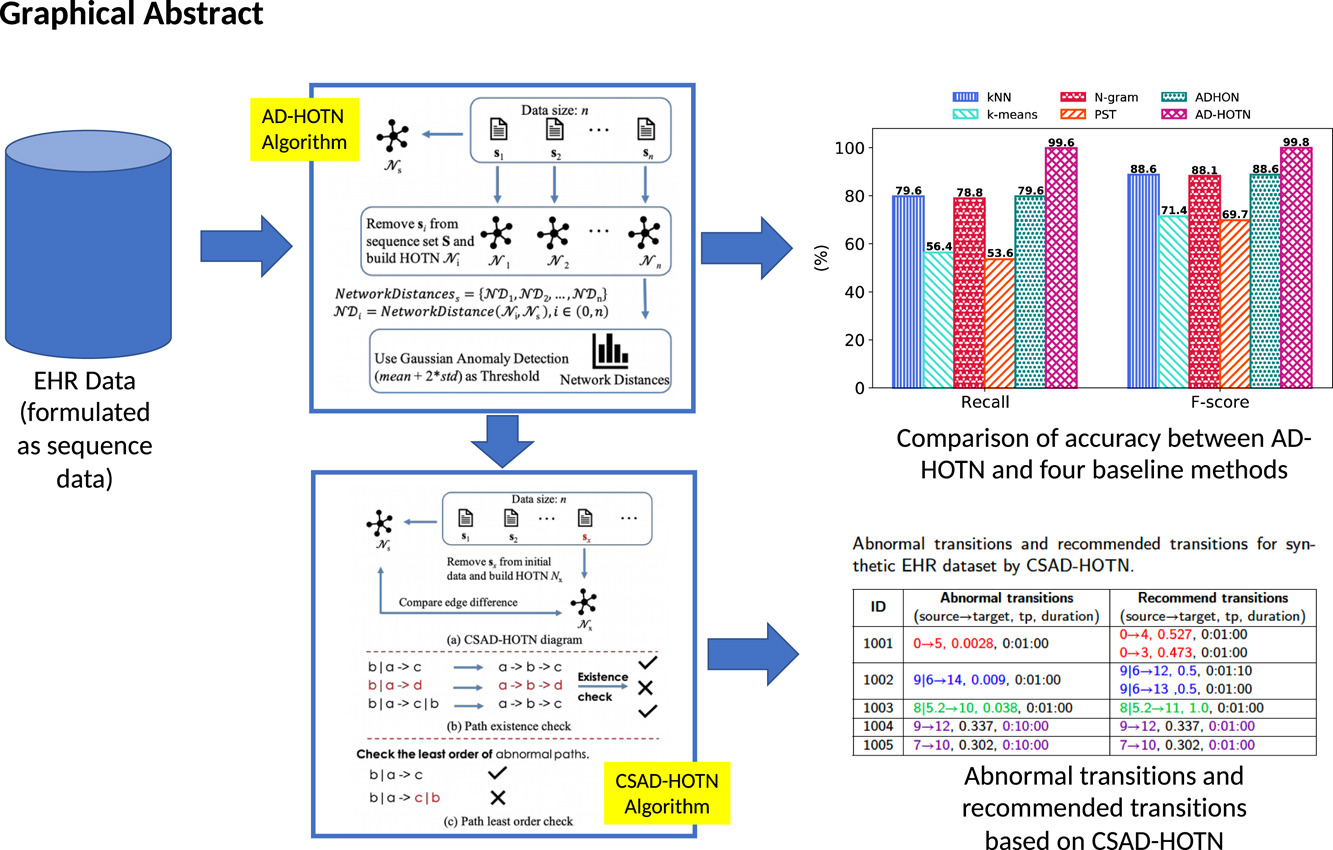 Detecting anomalous sequences is an integral part of building and protecting modern large—scale health information technology (HIT) systems. These HIT systems generate a large volume of records of patients’ state and significant events, which provide a valuable resource to help improve clinical decisions, patient care processes, and other issues. However, detecting anomalous sequences in electronic health records (EHR) remains a challenge in healthcare applications for several reasons, including imbalances in the data, complexity of relationships between events in the sequence, and the curse of dimensionality. Conventional anomaly detection methods use the finite sequence of events to discriminate sequences. They fail to incorporate salient event details under variable higher-order dependencies (e.g., duration between events) that can provide better discrimination of sequences in their models. To address this problem, we propose event sequence and subsequence anomaly detection algorithms that (1) use network—based representations of interactions in the data, (2) account for variable higher-order dependencies in the data, and (3) incorporate events duration for adequate discrimination of the data. The proposed approach identifies anomalies by monitoring the change in the graph after the test sequence is removed from the network. The change is quantified using graph distance metrics so that dramatic changes in the network can be attributed to the removed sequence. Furthermore, the proposed subsequence algorithm recommends plausible paths and salient information for the detected anomalous subsequences. Our results show that the proposed event sequence anomaly detection algorithm outperforms the baseline methods for both synthetic data and real—world EHR data.
